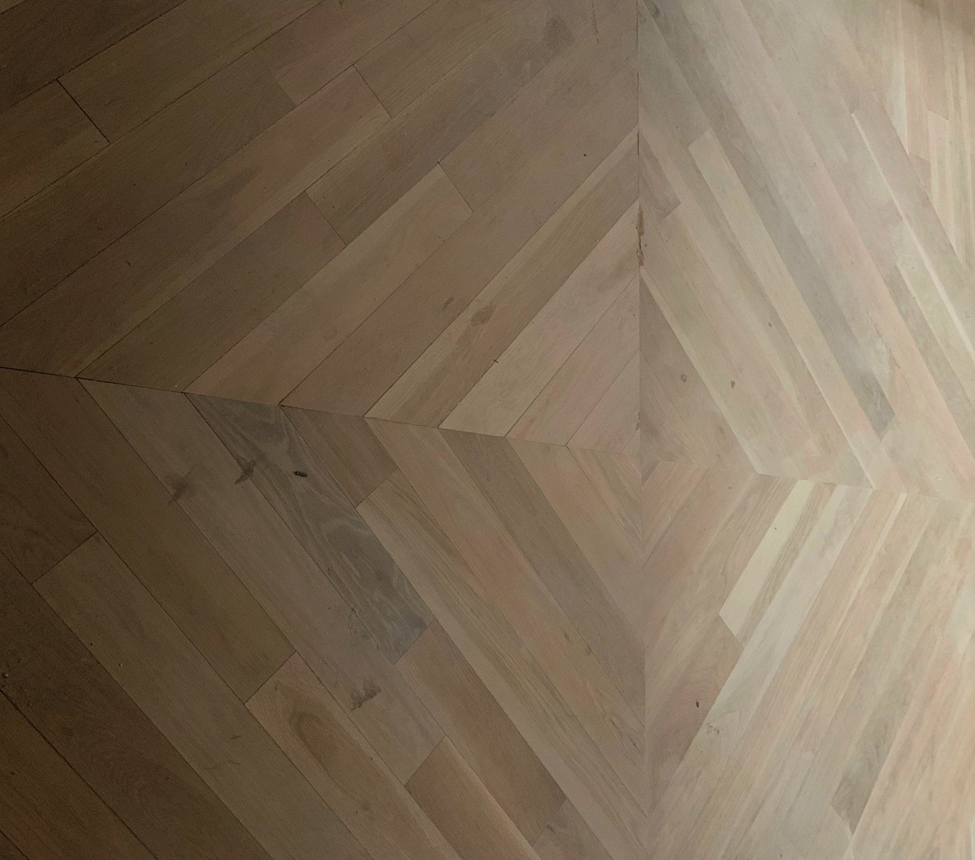 Parquet and herringbone designs may demand thousands of small hand-cut pieces. In fact, it is such exacting work that the artisan typically dry-lays the patterns prior to the final installation, in case modifications need to be made. These complex designs often involve several kinds of wood: a walnut herringbone pattern, for example, laid in the middle of a white oak floor.