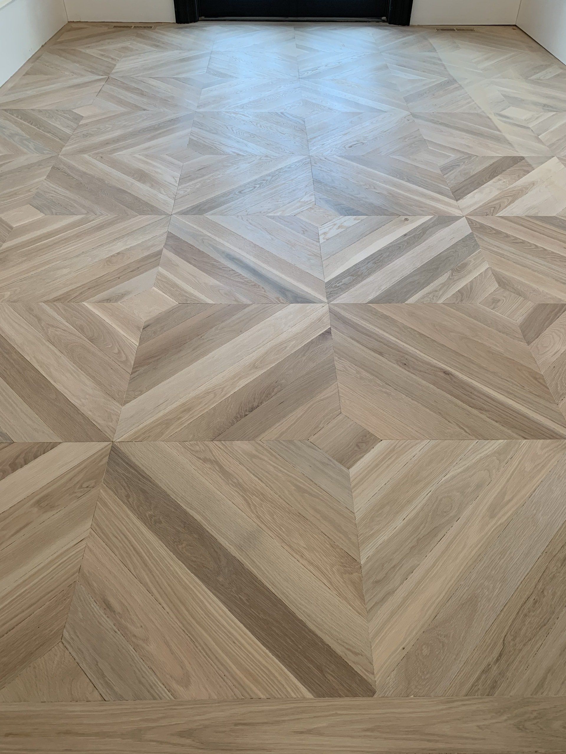 French Parquet wood flooring was originally designed to replace historic estates’ stone and marble floors. Those rigid surfaces eventually wreaked havoc on the mansions’ enormous wood frameworks. Parquet wooden floors, on the other hand, built using 3’ x 3’ square units, proved far more forgiving than the historic rock-hard surfacing. Not only did French Florentine Parquet prove architecturally functional, but also became universally famous for its eye-catching designs. Recently, Temple Johnson Floor was approached about a custom wood floor design. It called for scaling down a French parquet’s standard 3’ x 3’ squares to only 2’ x 2’. Clients could never order such a one-of-a-kind design through today’s big box, wholesale flooring stores, who depend on volume sales. It would be difficult to order them from anywhere, really, even though the clients had hoped to begin as soon as possible.